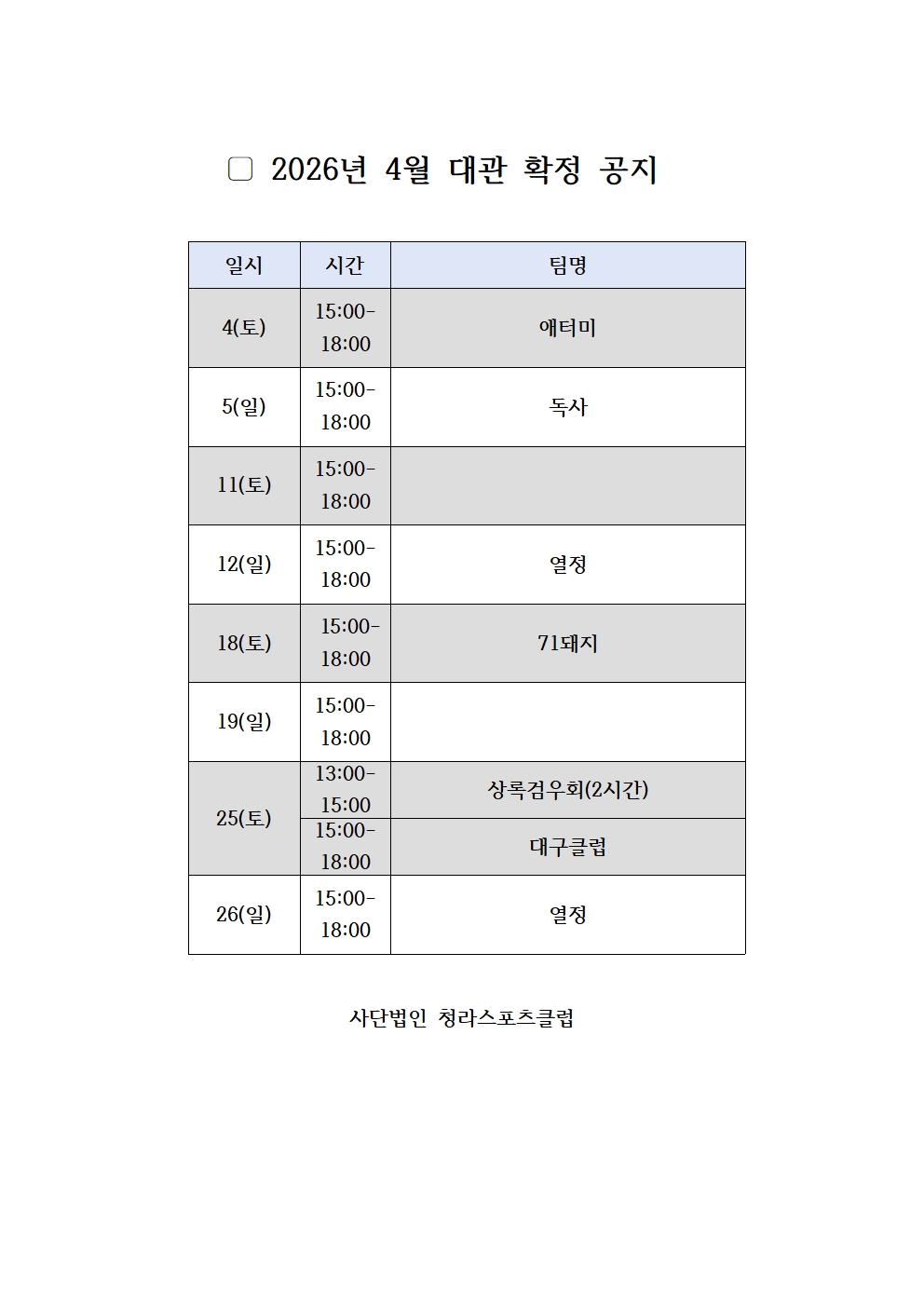 4월 체육관 대관 확정공지